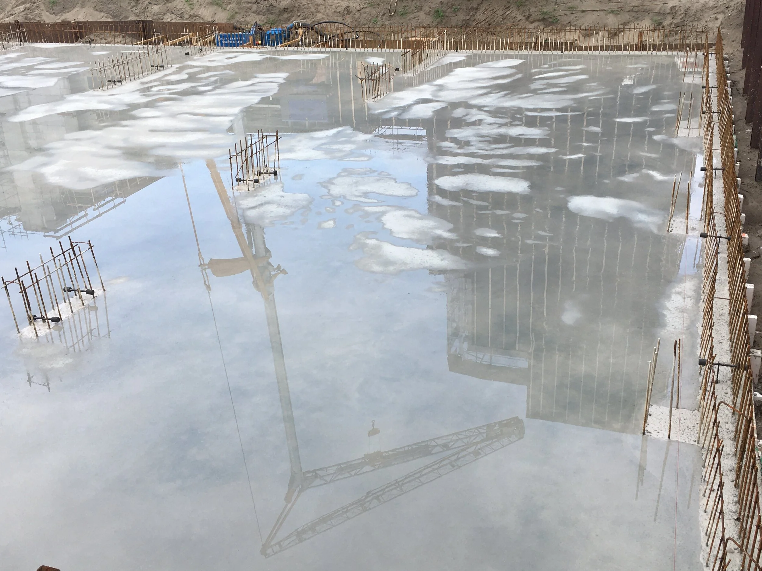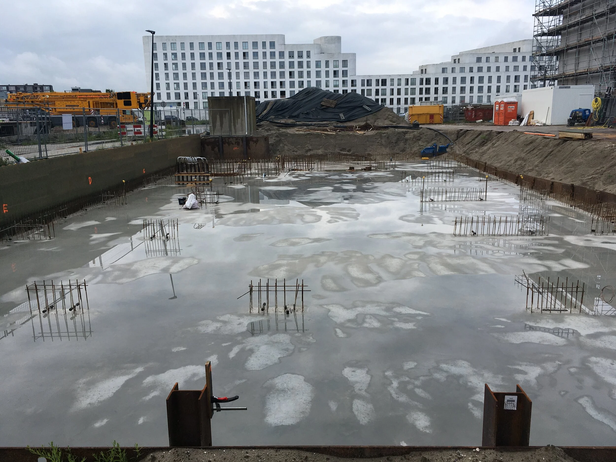 Nu, op een regenachtige dag in augustus, is het stil - dus ook een mooie dag om een blik te werpen op hoe ons kavel erbij ligt. Zand is vervangen door wat echt zal blijven. Deze laag fundament valt niet zomaar weg te vegen. De Warren lijkt net een spiegel: door het regenwater heeft zich tijdelijk een glazig laagje op het fundament gevormd.