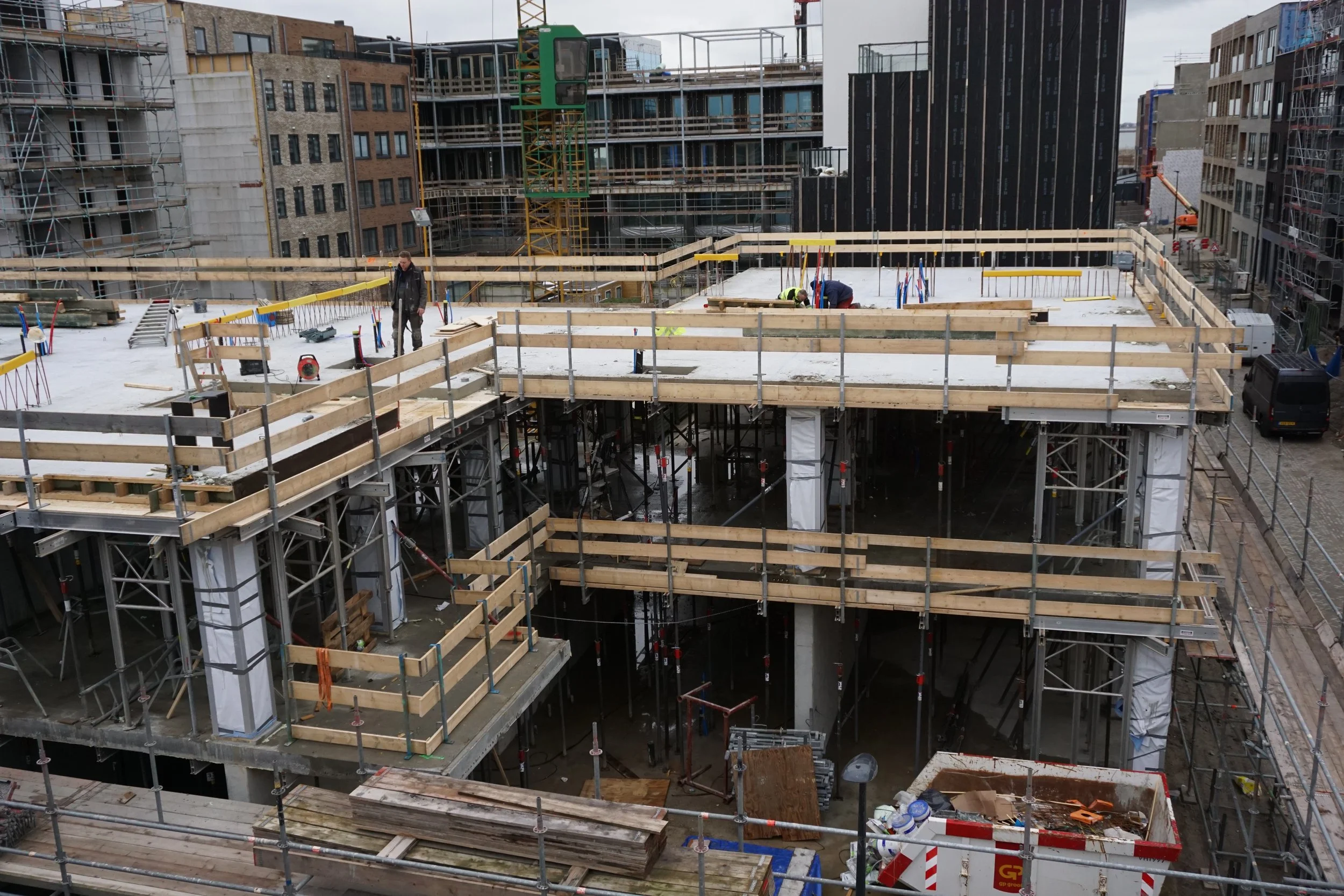 Het is vandaag zaterdag 22 januari en ik parkeer mijn fiets tegen een paal. De weg rondom onze bouwplaats is gedeeltelijk afgesloten. Dat is niet gek, want ons gebouw schiet met grote sprongen de lucht in en het wordt waarschijnlijk iets gevaarlijker om zo dicht bij de bouwactiviteiten te staan. Jammer wel dat ik niet met mijn camera een rondje kan lopen, maar toevallig kpmen net de buren uit hun auto gestapt en nodigen ze me uit om vanaf hun dakterras te fotograferen. Drie trappen op en daar sta ik: op ooghoogte met het momenteel hoogste punt van ons toekomstige huis!