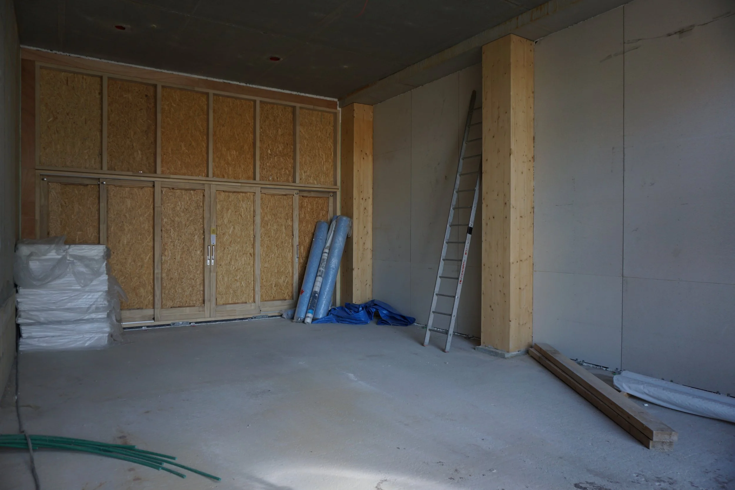Nu volgen een aantal woningen! We beginnen in een heerlijk hoge Free Willy op de begane grond. Nu lijkt deze ruimte nog een beetje donker want de ramen zijn bedekt, maar straks schijnt het zonnetje hier heerlijk naar binnen door de grote ramen. Door naar boven! Ook hier een Free Willy, ditmaal is goed te zien hoe de isolatielaag aangebracht wordt. Zie hier tevens het zonnetje. In een starterwoning hiernaast, op de tweede verdieping, lijkt het haast alsof er al geschilderd wordt. Leuke kleurtjes wel hoor! Misschien zo houden? Ook een klein inkijkje in wat voor materialen er allemaal gebruikt worden. Ook een leuk feit: de muren op de tweede verdieping staan inmiddels dus ook! Eens kijken hoe het er in de woonlaag hierboven aan toe gaat…