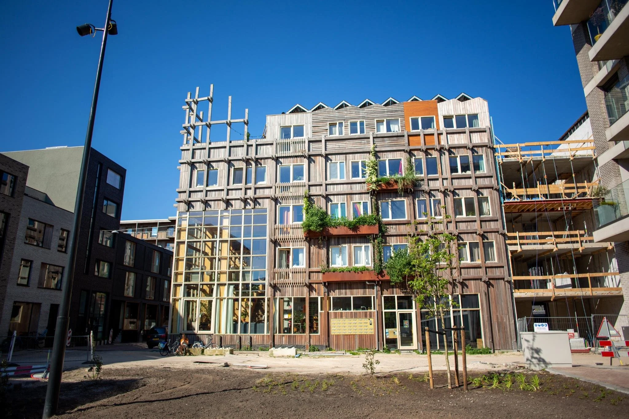 De groene en circulaire façade van De Warren van hergebruikte meerpalen