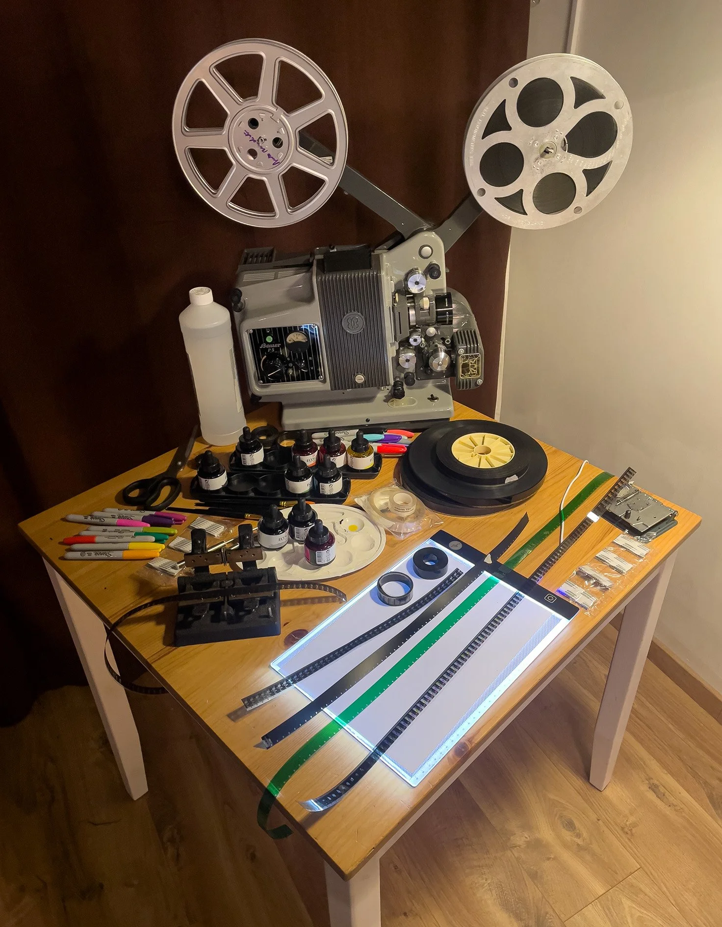 We animeren direct op oude 16mm filmrollen met ecoline, stiften, perforators en krassen met naalden en schuurpapier. De bewerkte stukken film plakken we aan elkaar en spelen we af op een 16mm projector uit de jaren ‘60.