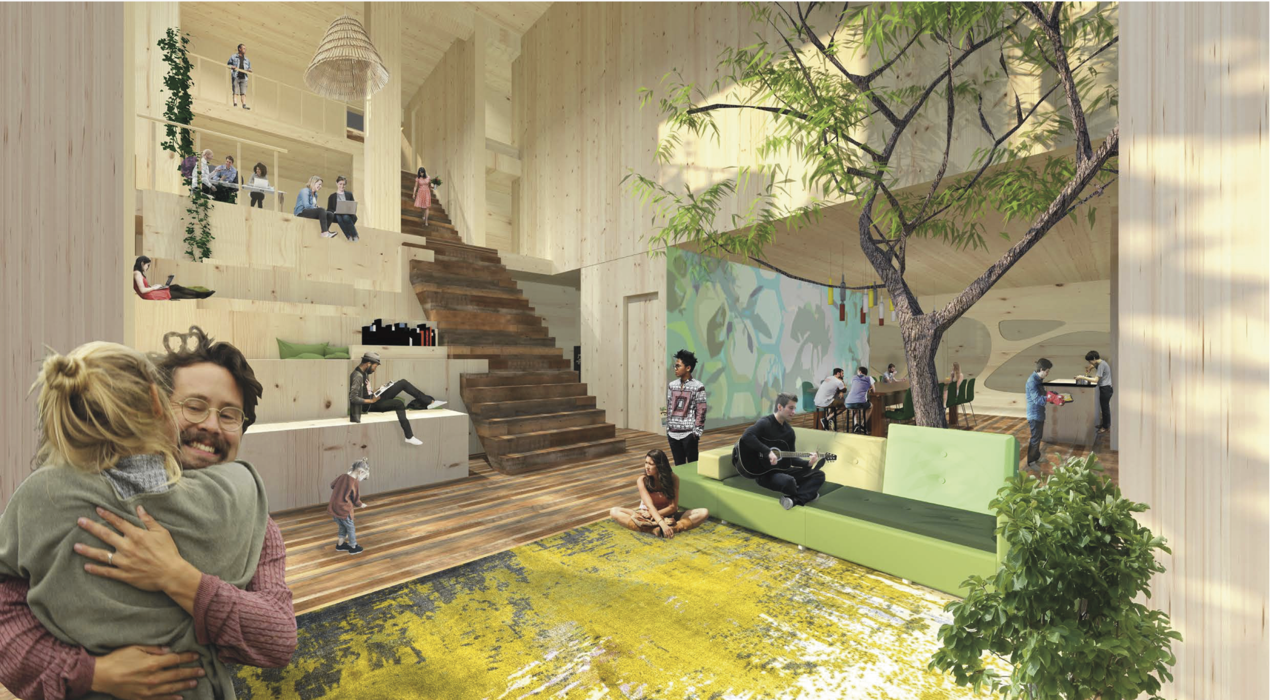 In deze render van onze grote hal door Naturfoed Srchitecture kan je goed zien hoeveel van het hout er zichtbaar is.