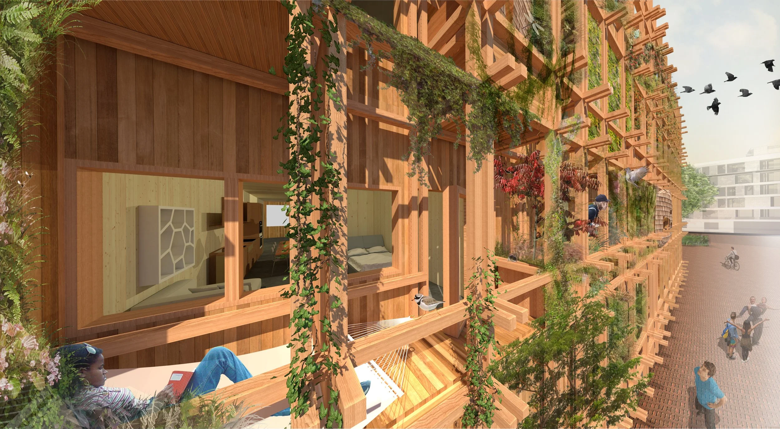 Een render van de gevel en voorzetgevel van De Warren door Natrufied Architecture