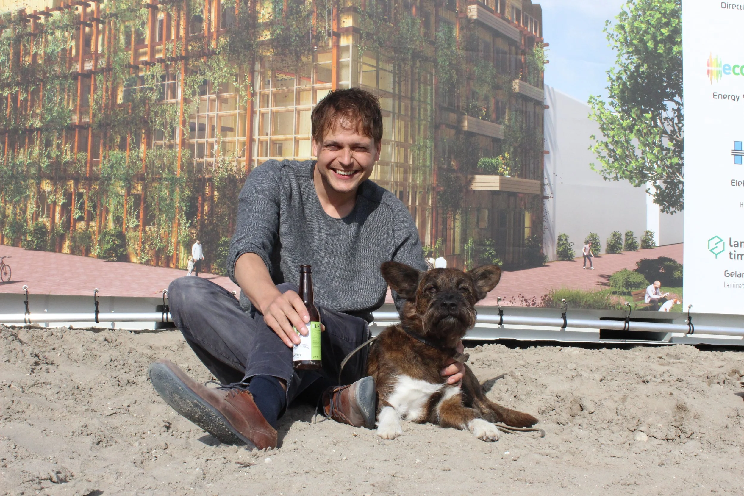 Gerard Roemers en Skipper voor een grote render van De Warren, waarop de houten gevel een hoofdrol speelt (na Skipper dan).